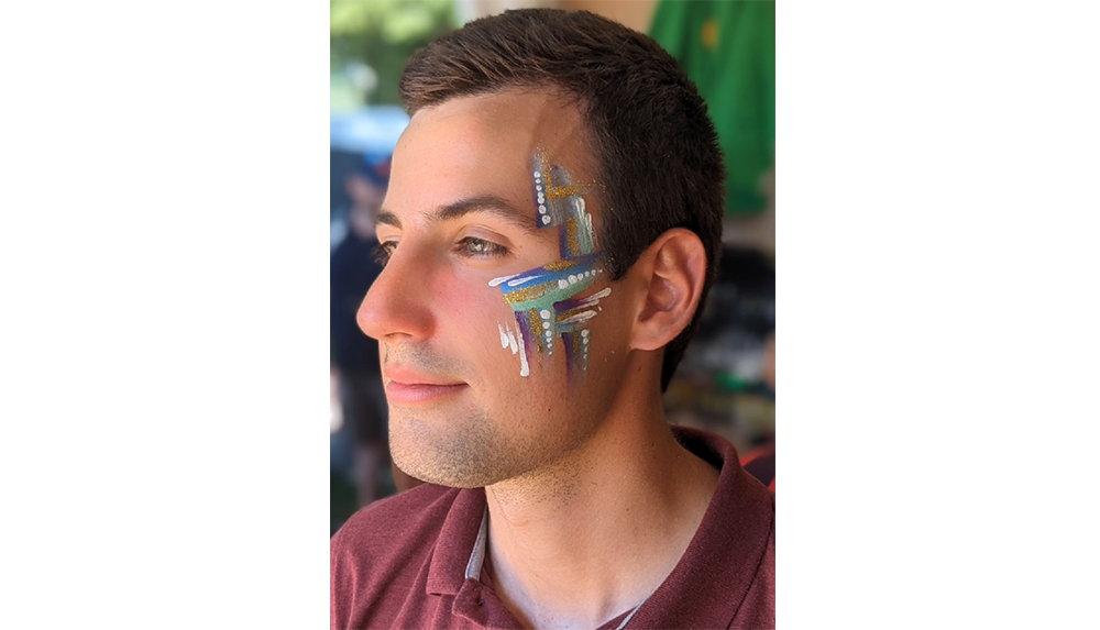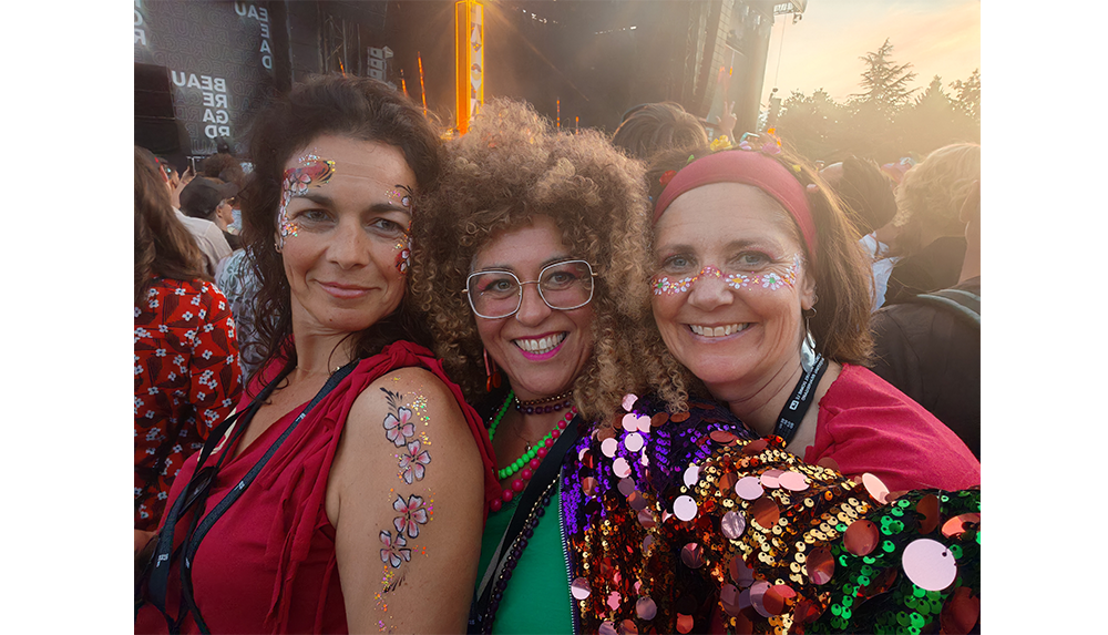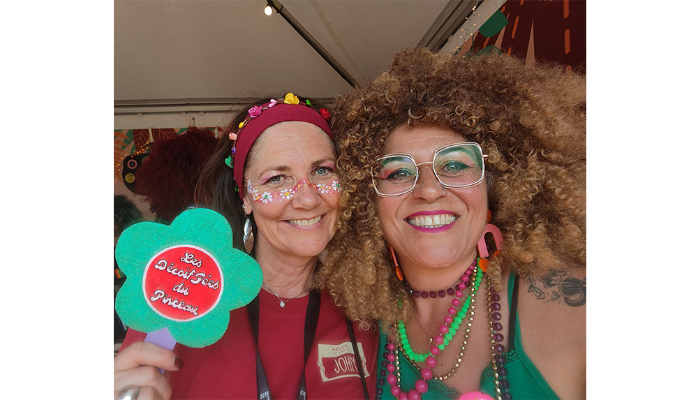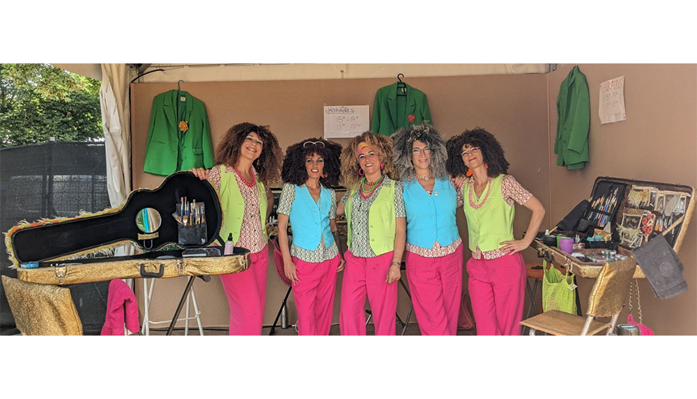 Couleurs et paillettes sont appliquées avec délicatesse sur le visage, le cou, les bras ou le décolleté, selon les envies de chacun-e. Dans des étuis de guitares électriques rehaussés de fourrures, elles disposent tout leur matériel et sur une musique disco métamorphosent petits et grands dans une humeur joyeuse et pailletée.